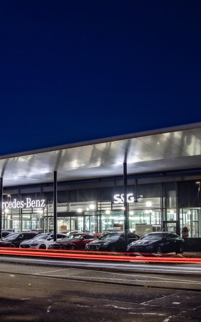Autohaus S&G Karlsruhe bei Nacht frontal fotografiert.